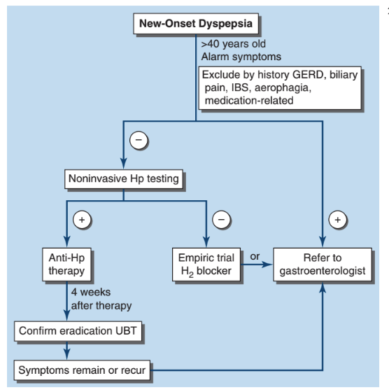 이제는 40세 미만이면서 경고증상이 없는 경우 우선 비침습적인 H.pylori 검사를 시행해서 양성이 확인된 경우 제균치료를, 음성인 경우 위산억제 치료를 시행하도록 변경되었다 (“Test and treat 전략”)