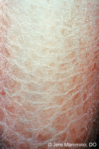 미세한 비늘로 덮인 홍반 → 도자기 모양 균열