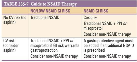 GI 위험도 ↓, CV 위험도 ↑ : Traditional NSAID (naproxen) + PPI/misoprostol or 비 NSAID 약물 고려
