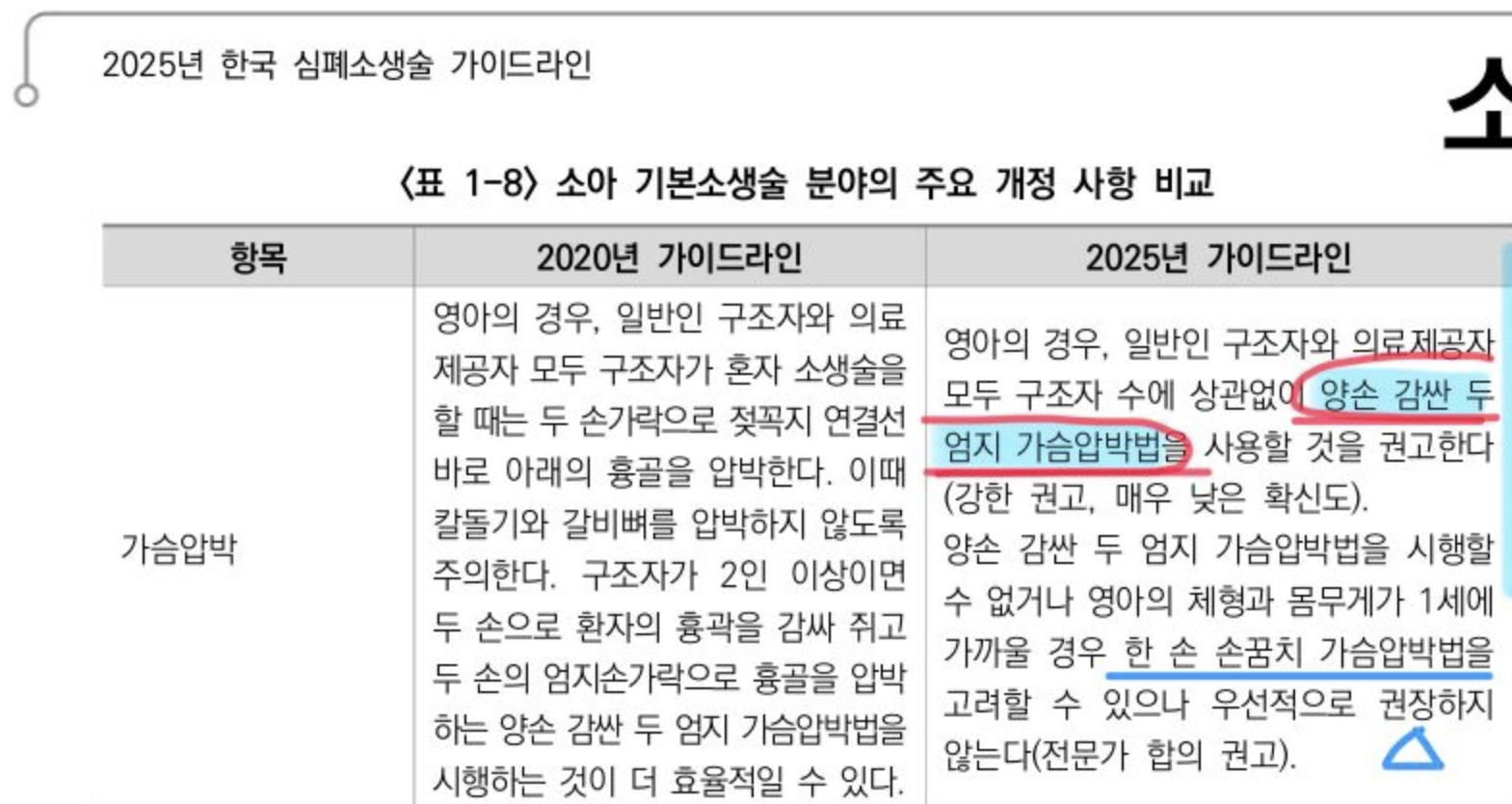 2025년 변경된 가이드라인에 따르면 구조자 수에 상관없이 영아의 경우 양손 감싼 두 엄지 가슴압박법을 사용할 것을 권고한다고 합니다.