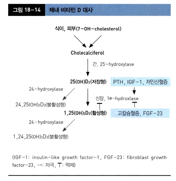 대사 과정: 피부 (자외선, cholesterol → cholecalciferol) → 간(25-OH-D, 저장형) → 신장(1,25-(OH)2D, 활성형)