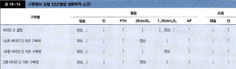 혈액검사 시 ALP 상승, 25-OH-D 감소, 저인산혈증
