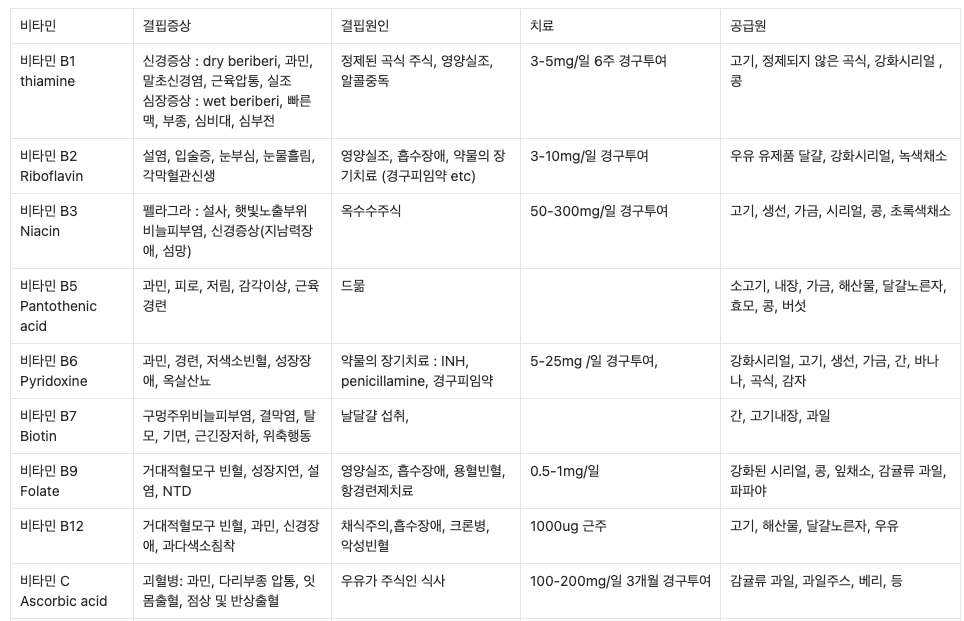 비타민 B1 (Thiamine): 결핍 시 각기병(beriberi), Wernicke 뇌병증.