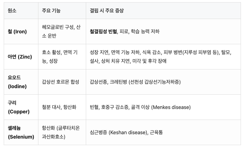 비타민 B12 (Cobalamin): DNA 합성, 신경 수초 유지. 결핍 시 거대적혈모구빈혈, 악성빈혈, 신경학적 증상.