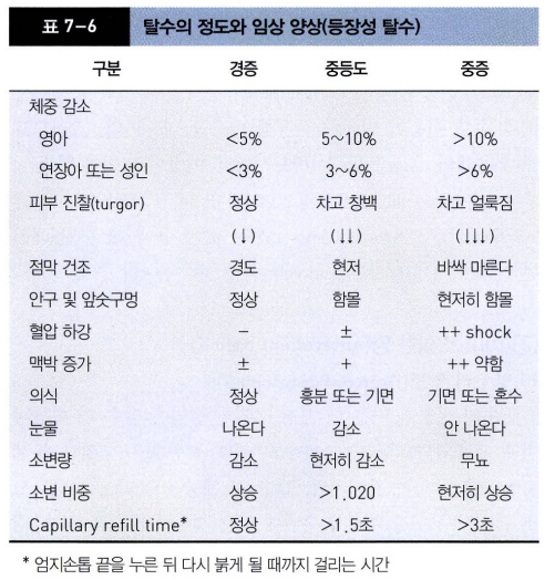 영아 체중의 10%, 연장아 체중의 6% 이상의 탈수는 중증 탈수에 해당