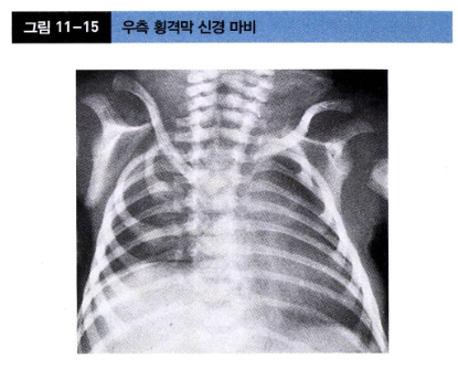 원인: 횡격막의 운동을 지배하는 횡격막 신경(C3, C4, C5 신경근에서 기원)이 분만 중 견인 손상을 받아 발생함.