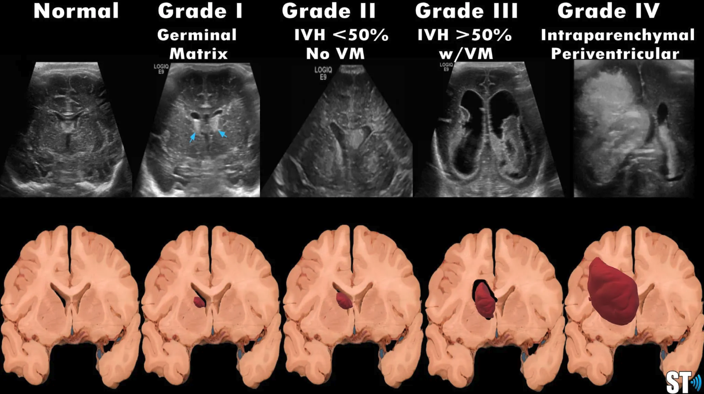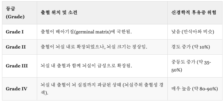출혈의 위치와 뇌실 확장 정도에 따라 Papile 등급 체계를 사용하여 중증도를 평가함. 예후 예측에 매우 중요
