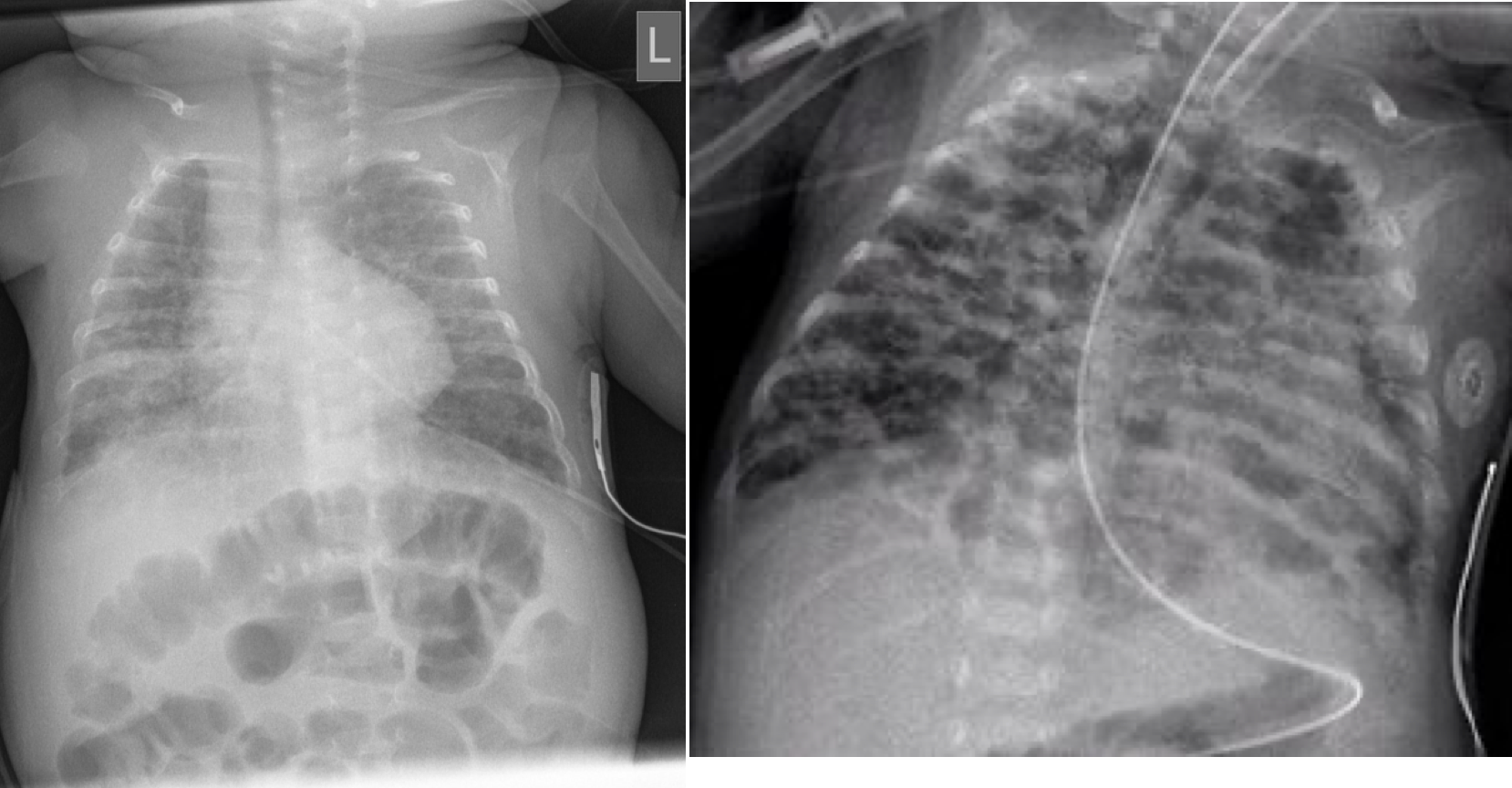 초기에는 RDS와 유사한 소견을 보이다가, 시간이 지나면서 폐 과팽창, 미만성 간질성 음영, 섬유화 띠, 낭성 변화(bubbly lung) 등이 혼재된 양상을 보임