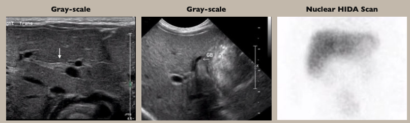 HIDA scan : 담즙 배출 여부 확인, 담도폐쇄증과의 감별 (검사 초반 담즙배설이 지연되지만, 수시간이 지나면 장으로의 담즙 배설이 확인)
