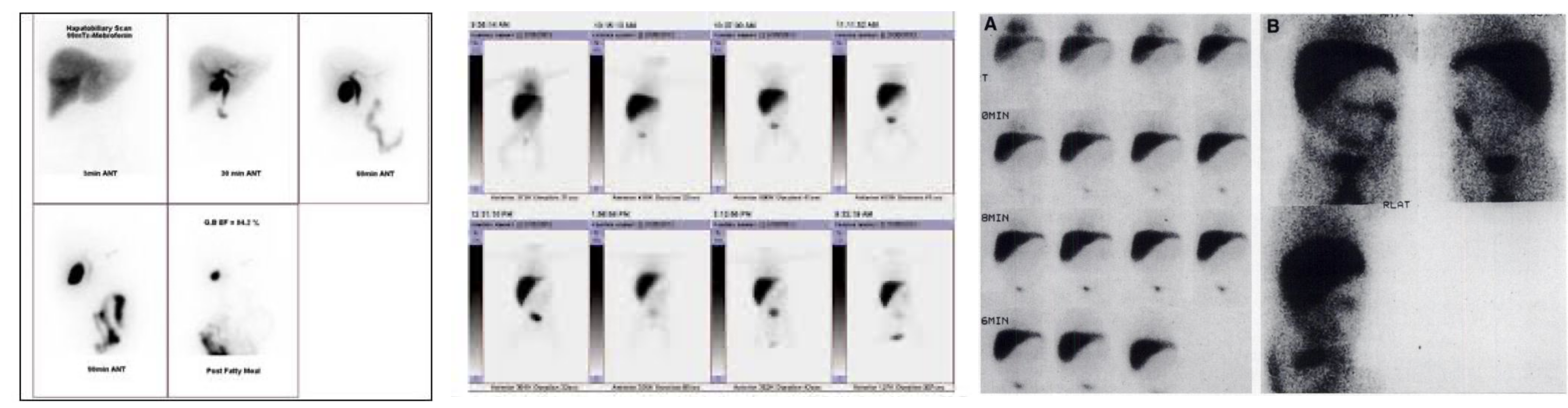 왼쪽 : normal HIDA scan. 간 uptake → biliary excretion → 소장에서의 uptake 확인