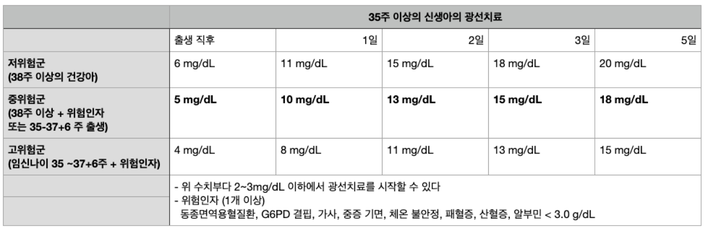 제태연령 35주 이상의 신생아의 광선치료 적응증