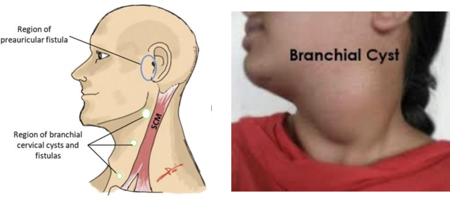 임상양상: 1st ~ 4th branchial cleft에서 기원한 낭종. 귓바퀴앞, 목의 측면, 흉쇄유돌근 앞쪽 하부 1/3에 부드러운 낭종으로 발견됨. 감염 시 통증과 함께 커질 수 있음.