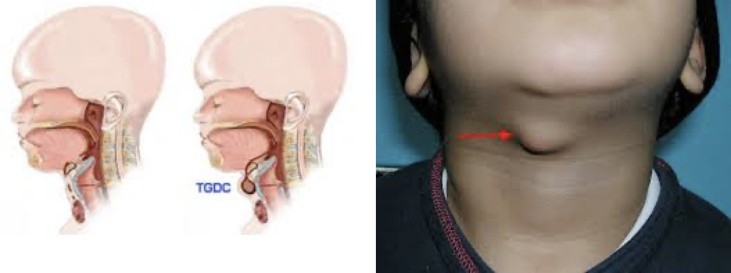 임상양상: 발생과정 중 갑상샘이 발생, 이동하는 구조물인 thyroglossal duct 의 remnant로, 목의 정중앙선에 위치하며, 혀를 내밀거나 침을 삼킬 때 위로 움직이는 특징적인 소견을 보임.