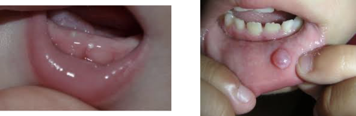엡스타인 진주(좌): 상피세포의 일시적 축적으로 인해 발생, 1-2mm크기의 흰색 작은 낭종이 입천장이나 잇몸에 발생. 수주 이내 자연 소실됨
