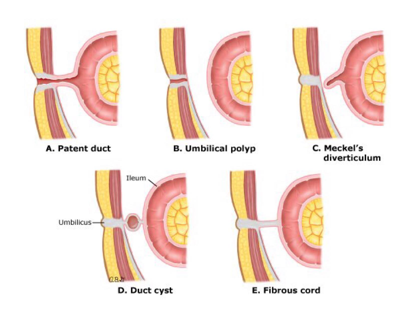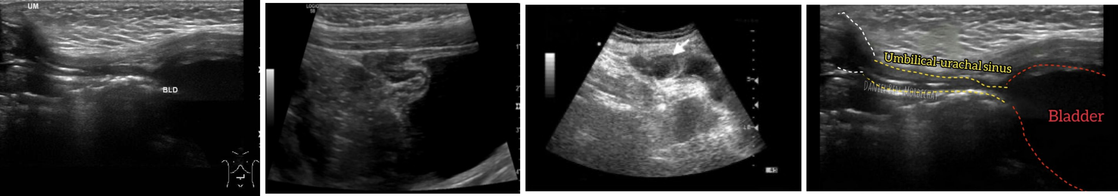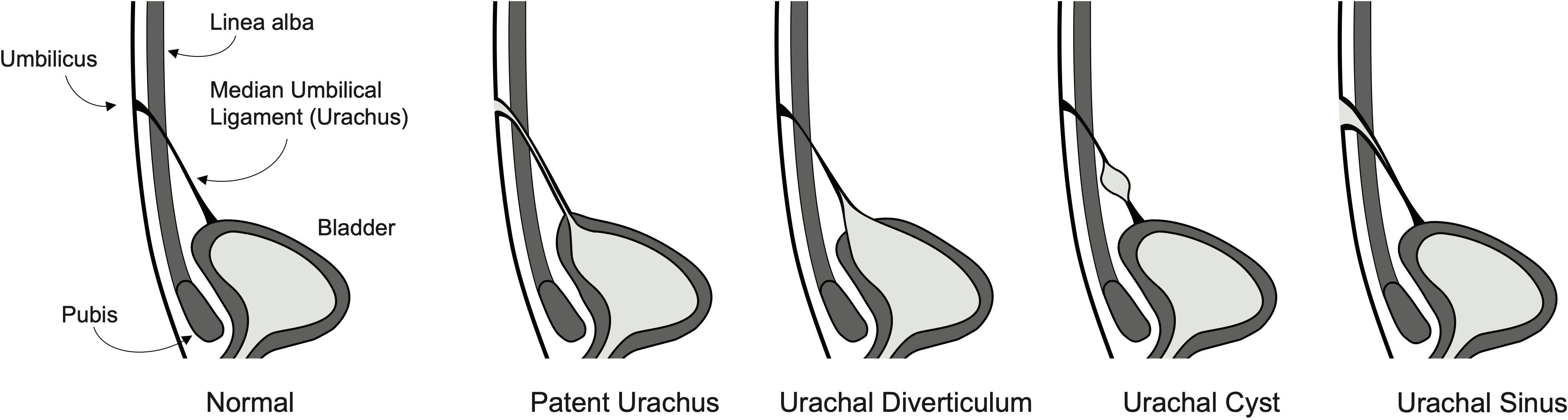 태아기에는 방광과 제대를 연결하는 urachus가 존재하는데, 출생 전후로 섬유화되면서 median umbilical ligament로 퇴화됨. 이때 폐쇄가 불환전하면 다음 네가지 형태의 이상이 발생할 수 있음