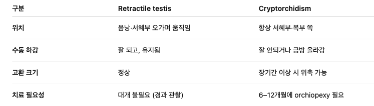 정의: 정상적으로 음낭에 내려와 있는 고환이 강한 cremasteric reflex 때문에 일시적으로 서혜부까지 올라가는 경우