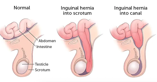 대부분 Indirect hernia, processus vaginalis가 선천적으로 덜 닫히면서 탈장이 발생함.