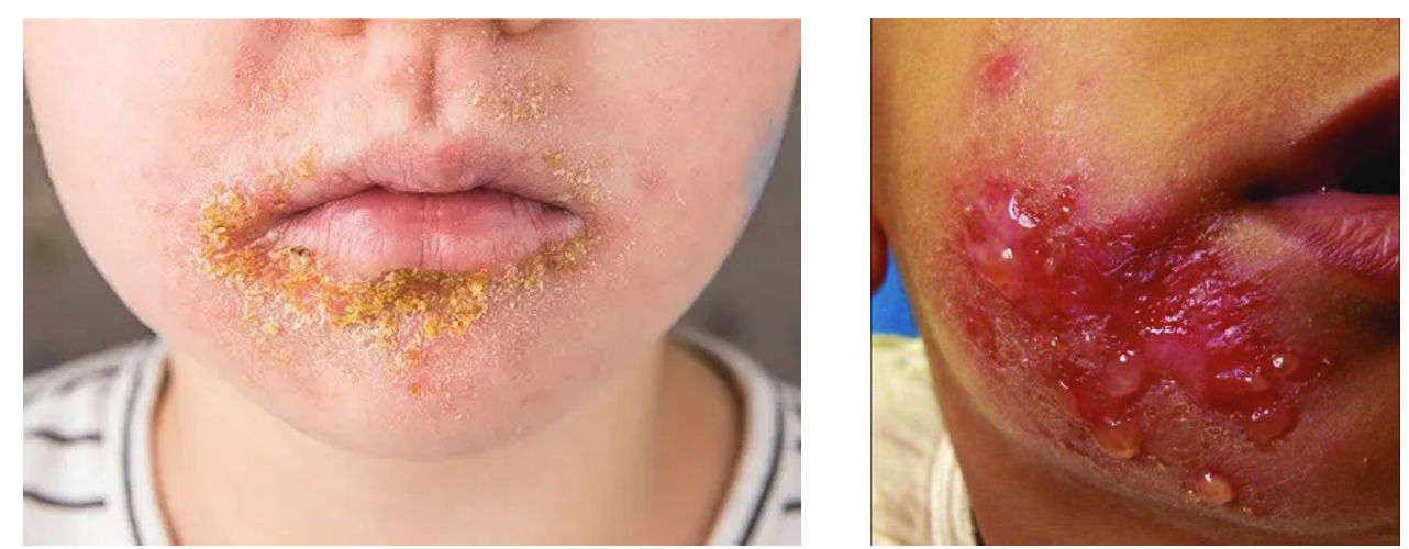 임상 양상: 외상이 생긴 얼굴/팔다리의 피부에서 시작, 작은 수포/농포 → 지름 2cm 미만의 crust