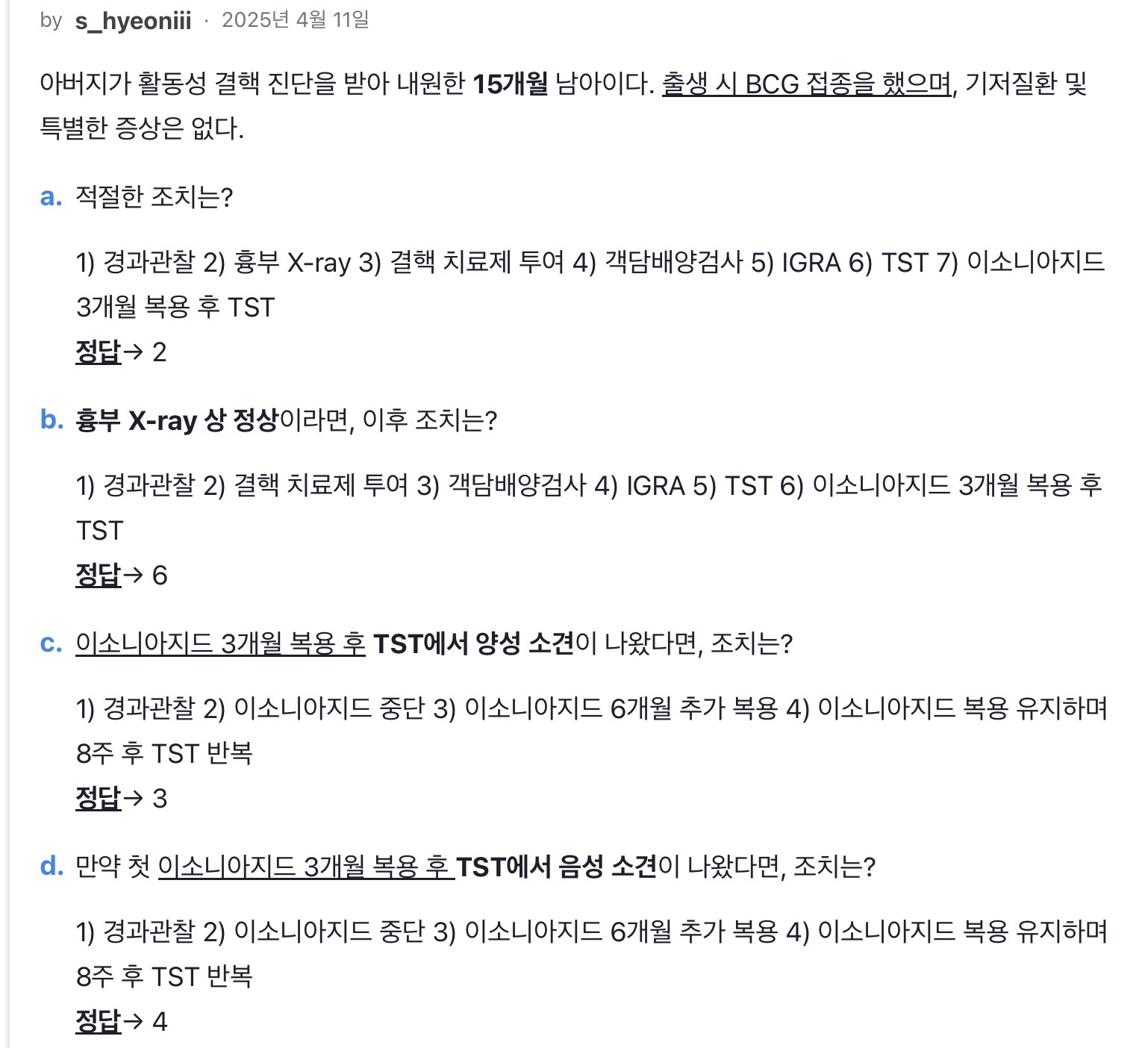 지금 b,d문제에서 답대로라면 1차 tst전부터 8주 inh를 주는거라서 총 두번 inh주게되는거같은데 알고리즘이랑 안맞는거같습니디.