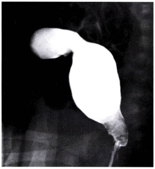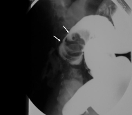 바륨 대장조영술: 신경절이 없는 좁아진 부위(narrow segment)와 그 위로 확장된 부위(dilated segment)가 관찰됨. (transition zone 확인)