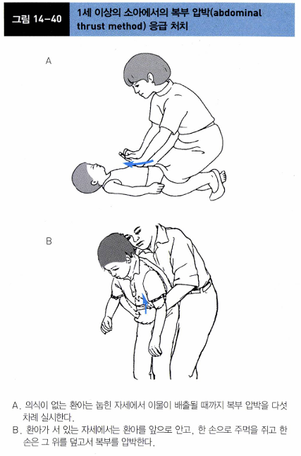 의식이 있는 경우: 소아의 뒤쪽에서 하임리히법(Heimlich maneuver, 복부 밀어내기)을 시행함. 환자의 뒤에 서서 복부를 감싸고 주먹으로 검상돌기 아래를 빠르고 강하게 위로 밀어 올림.