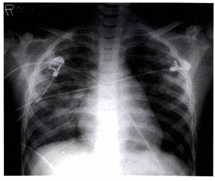폐부종 흉부 X-ray: 전 폐야에 걸친 폐침윤 증가, 폐경결 (consolidation) 관찰
