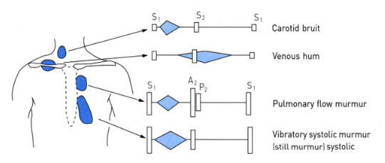 생리적 폐동맥 분지 협착: 생후 수개월 내의 신생아, 영유아에서 흔히 들림. 제2좌측 흉골연/폐의 말단 부위에서 들리는 짧은 midsystolic murmur