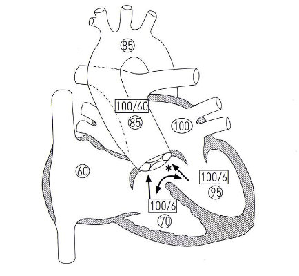 심도자술: 양심방, 양심실, 대동맥의 산소포화도가 거의 같음