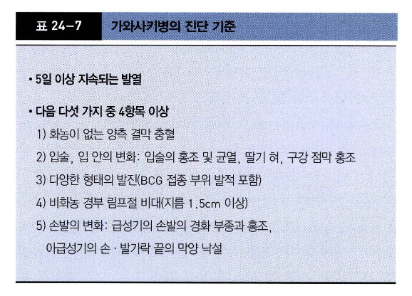 급성기 증상: 항생제에 반응없는 고열(1-2주 이상 지속), 양측 비삼출 결막염, 구강 인두 점막 홍반, 딸기혀, 입술 균열, 손발의 부종/홍조, 다양한 형태의 발진, 비화농 경부 림프절염