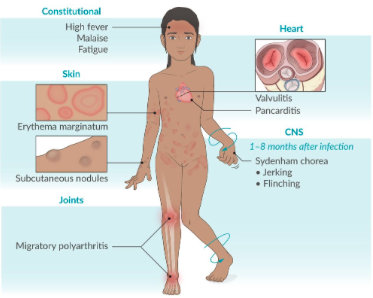 원인: GAS의 세포막 단백 (M protein)의 혈청형 중 특정 혈청형이 유전적으로 감수성이 있는 숙주에서 질병 유발