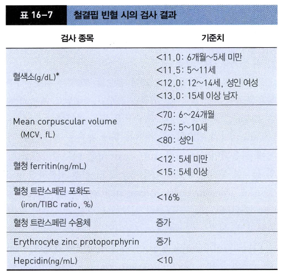 철분 섭취 부족: 식사불량/1세 이전 우유 섭취, 만성 설사, 흡수장애