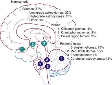 성인과 달리 대부분 천막하(infratentorial)에 발생하며(약 60%), 조직학적으로 신경교종(glioma)이 흔함