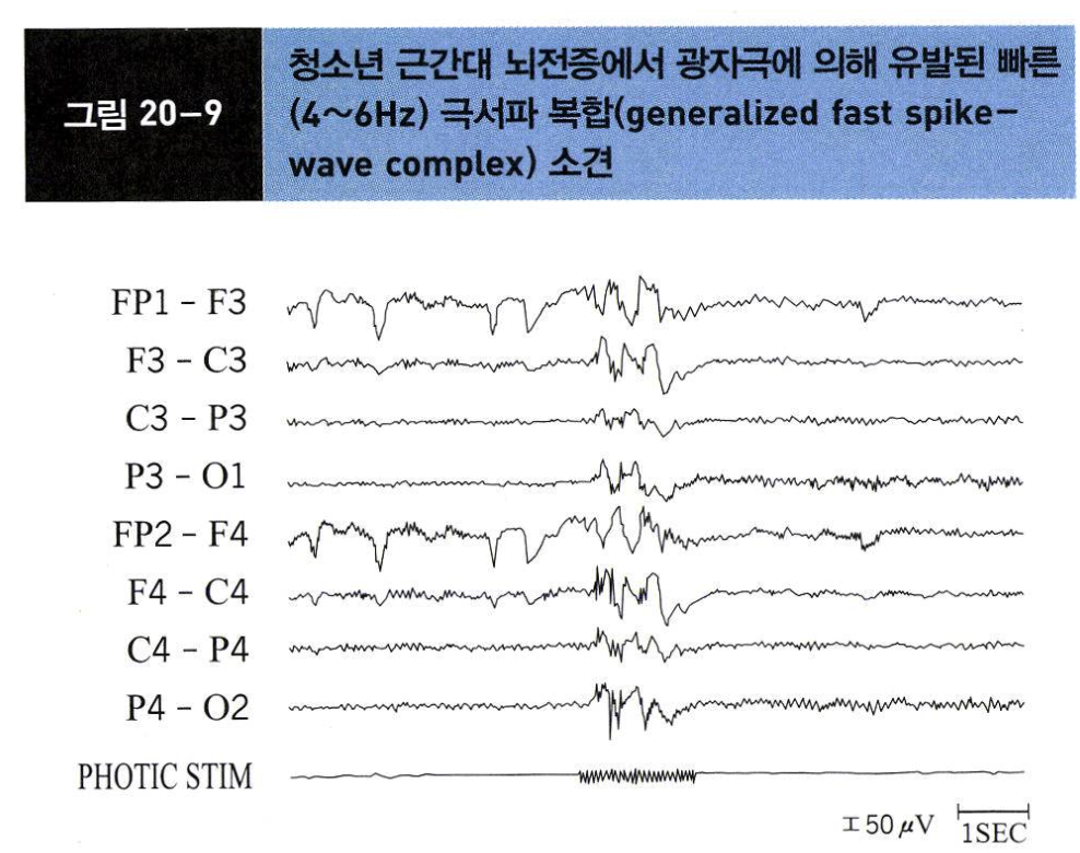 수면 박탈, 음주, 피로 등에 의해 쉽게 유발, 광감수성