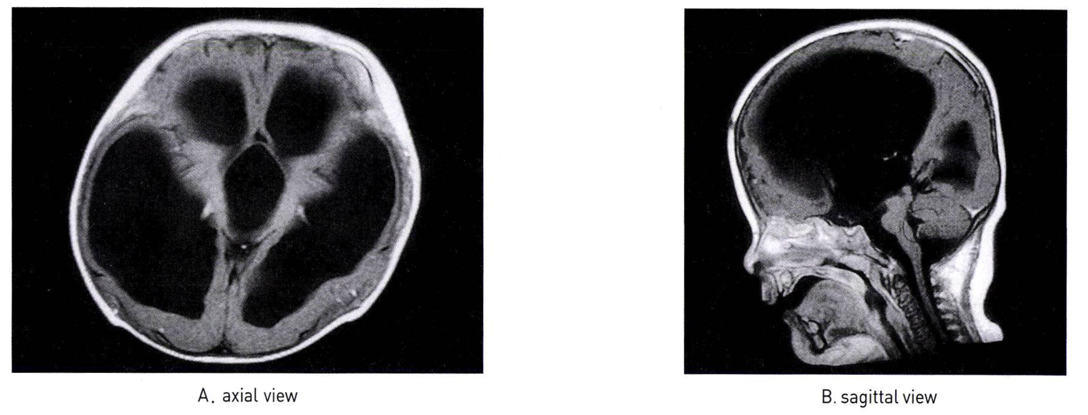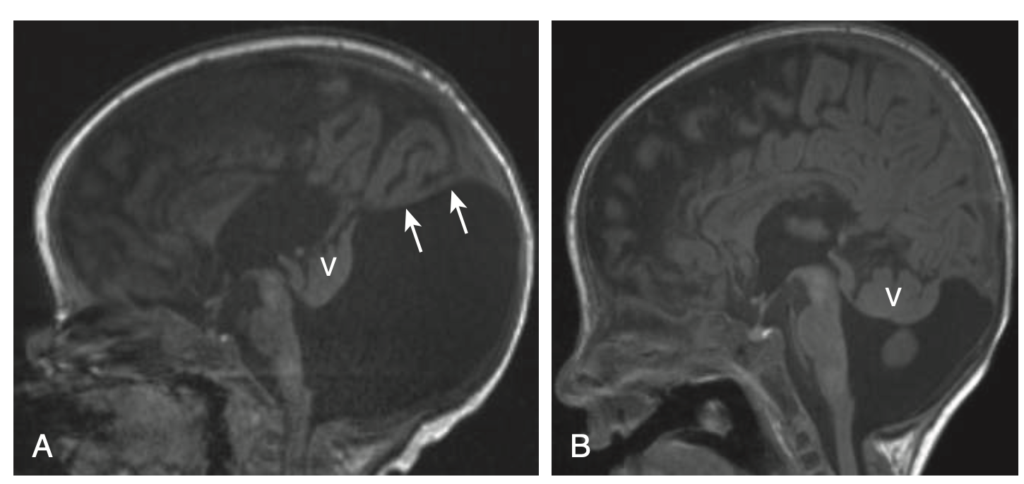 영상 특징 (MRI): 측뇌실이 평행하게 주행, 제3뇌실 위치 높음, colpocephaly (후두각 확장) 동반