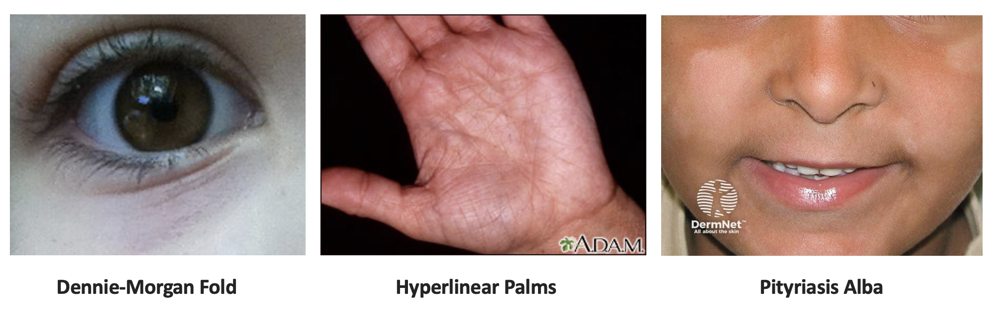 피부 건조증 (Xerosis): 가장 흔한 소견. 피부 장벽 기능 저하의 증거.