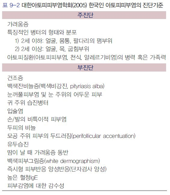 병력 청취 (가려움증, 만성/재발성 경과, 아토피 가족력) 및 신체 진찰 (연령별 특징적 병변)이 핵심.