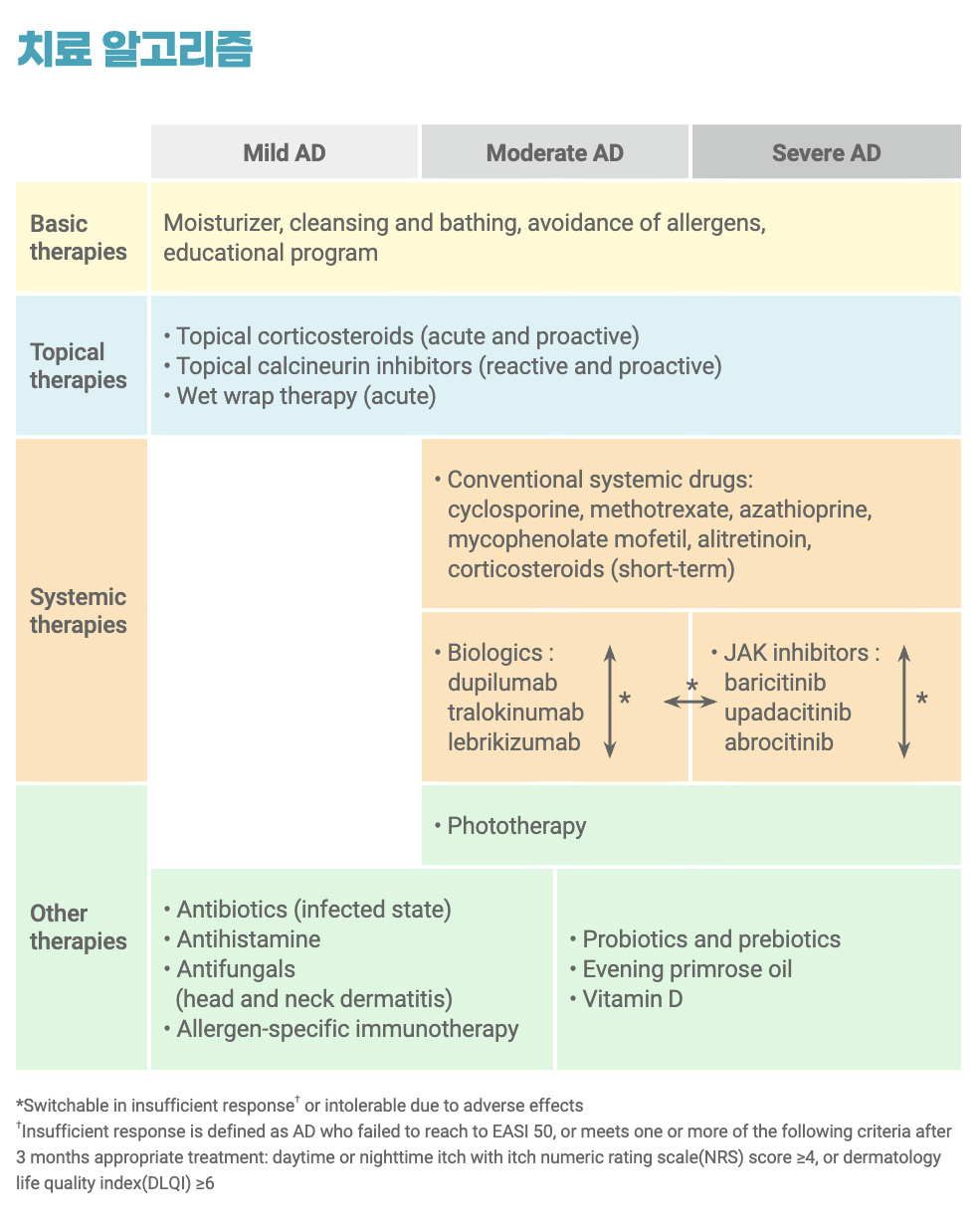 치료의 흐름은 전신 면역억제제 보다는 생물학적 제제를 중등증 AD에서부터 적극적으로 사용하는 방향으로 변하는 중이다.