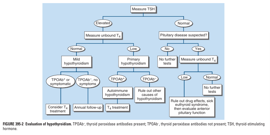 Free T4 낮음: 약물 영향 배제, Sick euthyroid syndrome 배제 후 → 전엽 뇌하수체 기능 평가 (Evaluate anterior pituitary function)