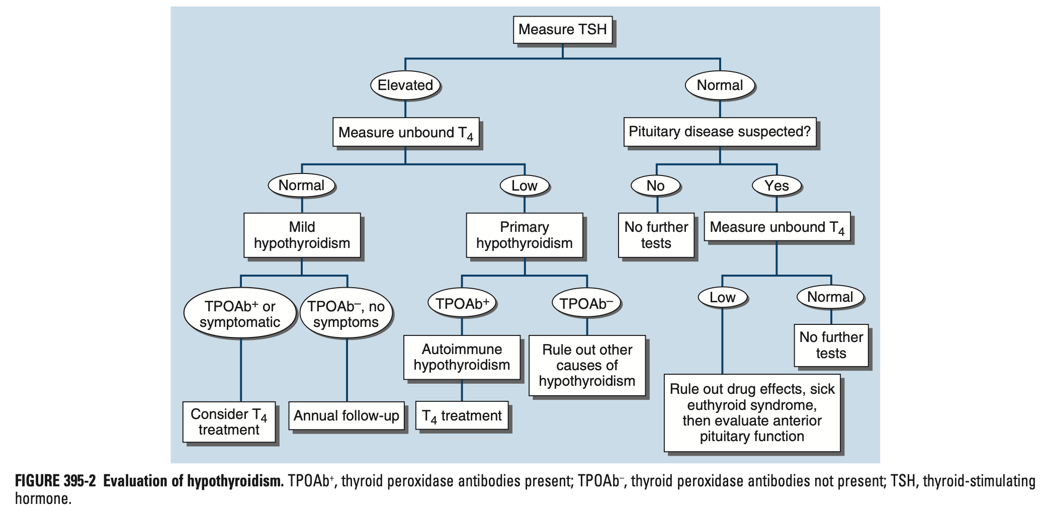 감별: 약물 영향 배제, 정상 갑상선기능 병적 증후군(Sick euthyroid syndrome) 배제