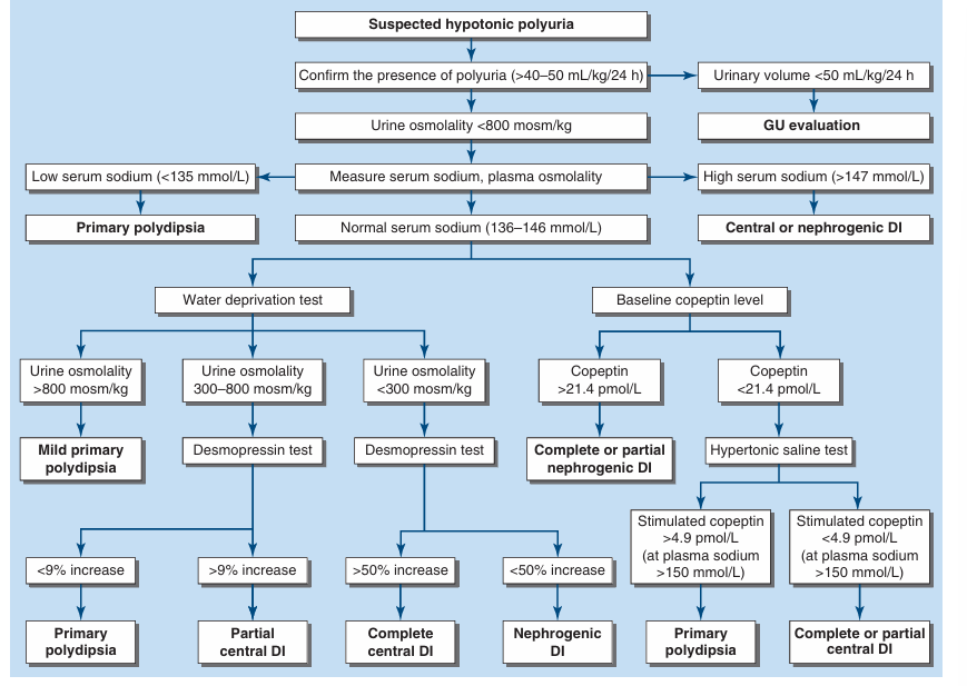 자극 후 Copeptin < 4.9 pmol/L: 중추성 요붕증 (Complete or partial Central DI)
