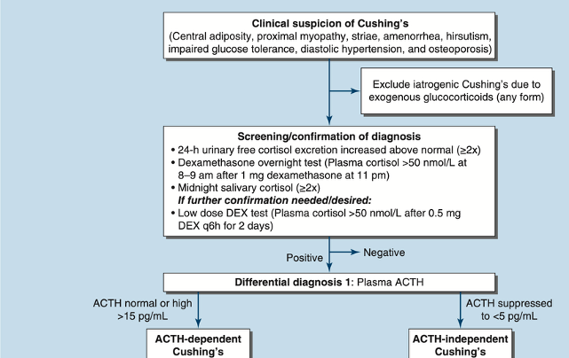 추가 확진 필요시: 저용량 덱사메타손 억제 검사 (Low dose DEX test) (0.5mg q6h for 2 days) → 혈장 코르티솔 > 50 nmol/L (1.8 µg/dL)