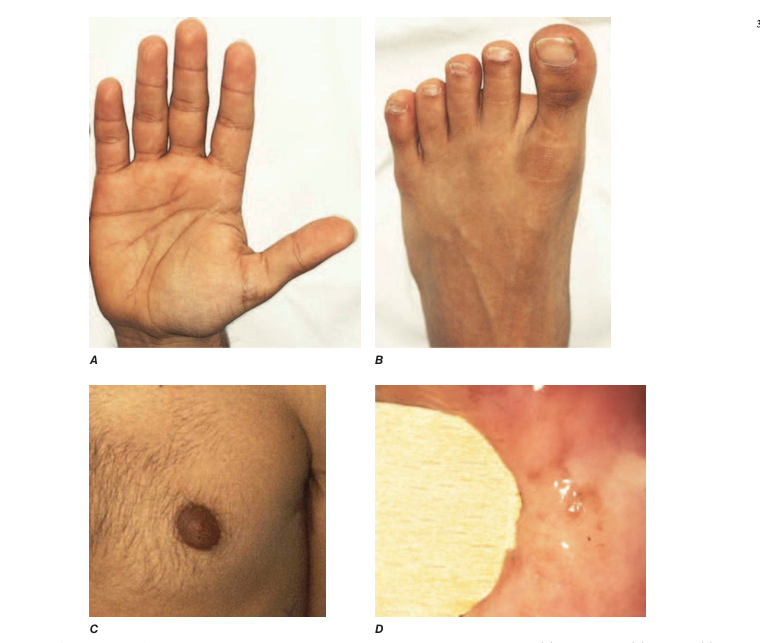 과색소침착: ACTH 및 POMC 유래 펩타이드 증가로 인해 피부, 점막(잇몸, 혀), 마찰 부위(손바닥 주름, 팔꿈치), 흉터에 색소 침착 발생
