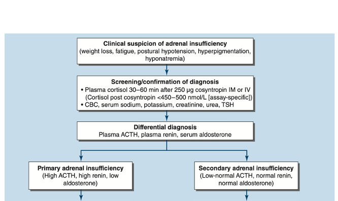 일차성 부신기능저하증: ACTH 높음 (>2배), 레닌 높음, 알도스테론 낮음