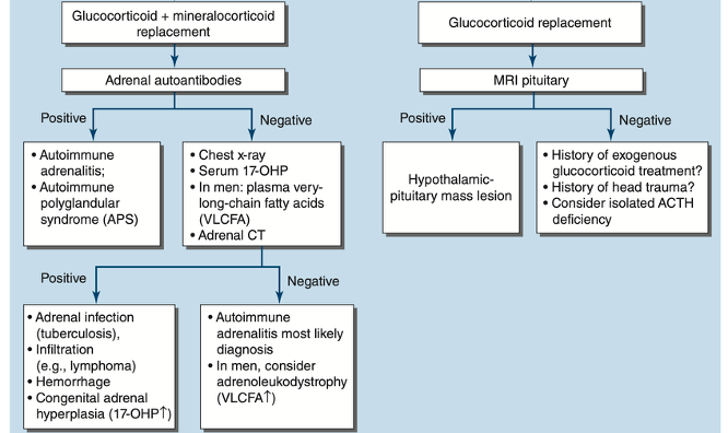 유전성: 선천성 부신 과형성(CAH, 21-hydroxylase 결핍), 부신백질디스트로피(X-linked ALD, 남성에서 주의)