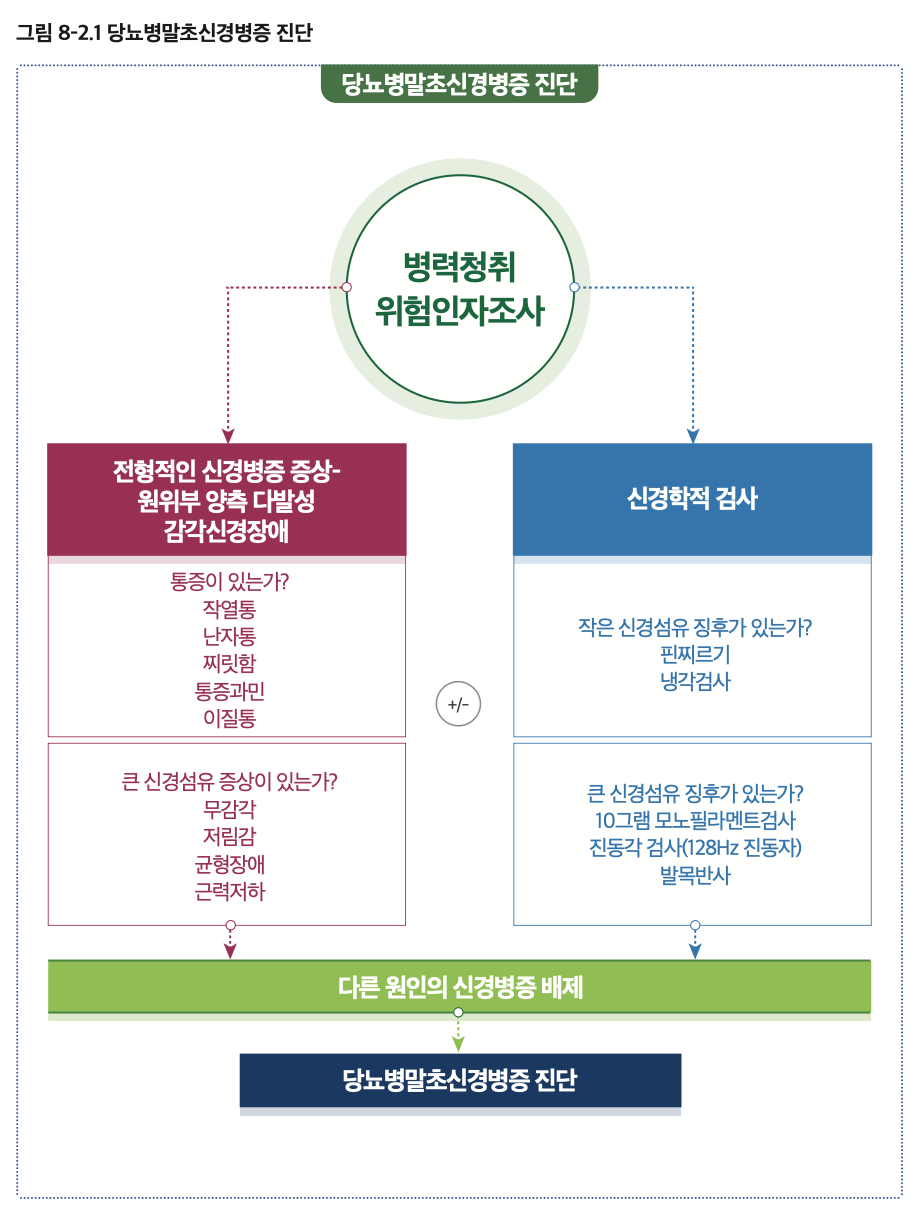 큰 신경섬유 징후 검사: 10g 모노필라멘트검사(압각), 진동각 검사(128Hz 진동자), 발목반사(Ankle reflex)