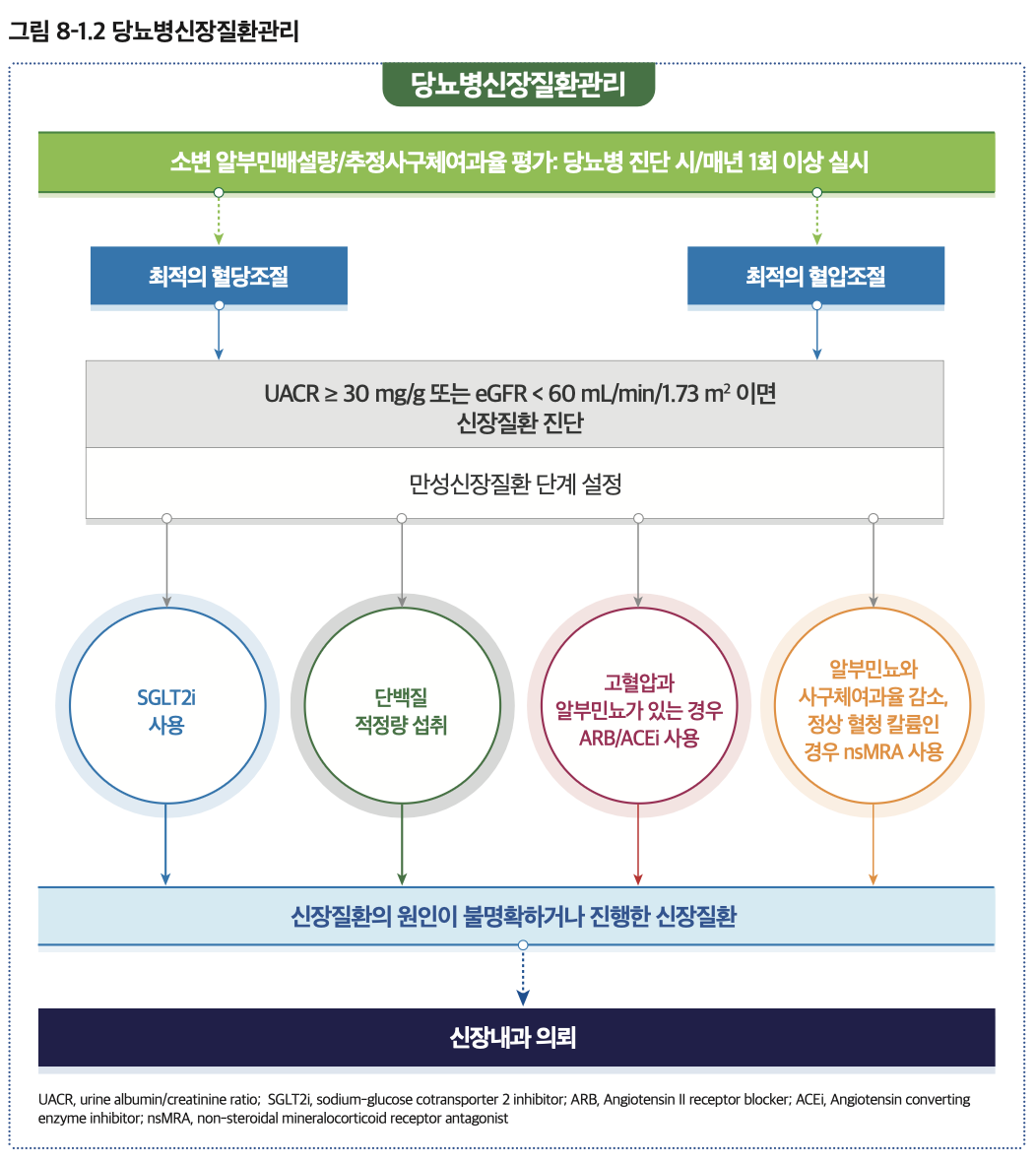 정의: 당뇨병으로 인한 만성 콩팥병; UACR ≥ 30 mg/g 또는 eGFR < 60 mL/min/1.73 m²가 3개월 이상 지속되는 경우