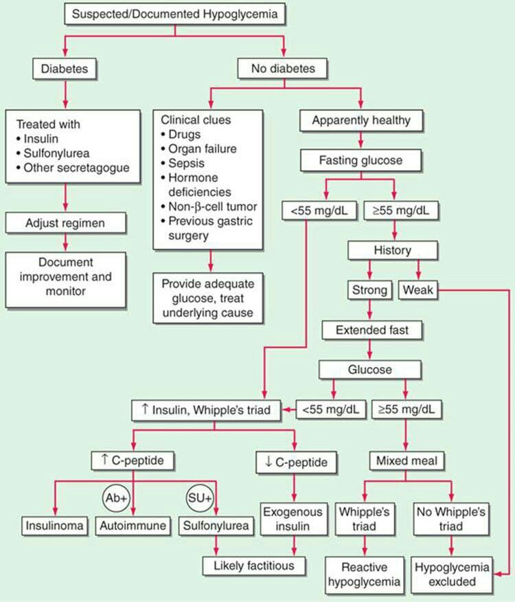 C-peptide 증가: 인슐린종, Sulfonylurea/Glinide 복용, 인슐린 자가면역 증후군