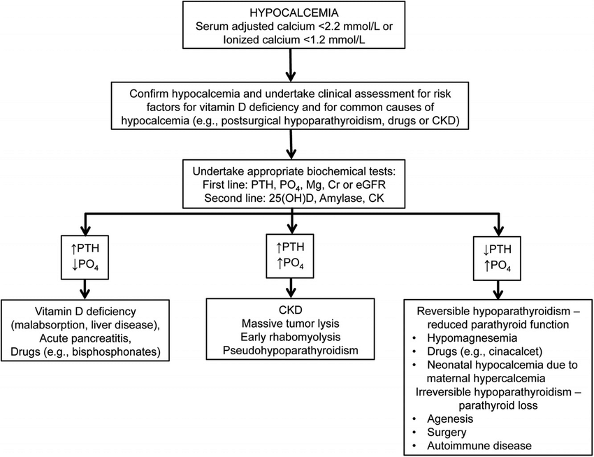기타: 종양 용해 증후군(Tumor lysis), 대량 수혈(Citrate에 의한 칼슘 결합), 불화물(Fluoride) 중독