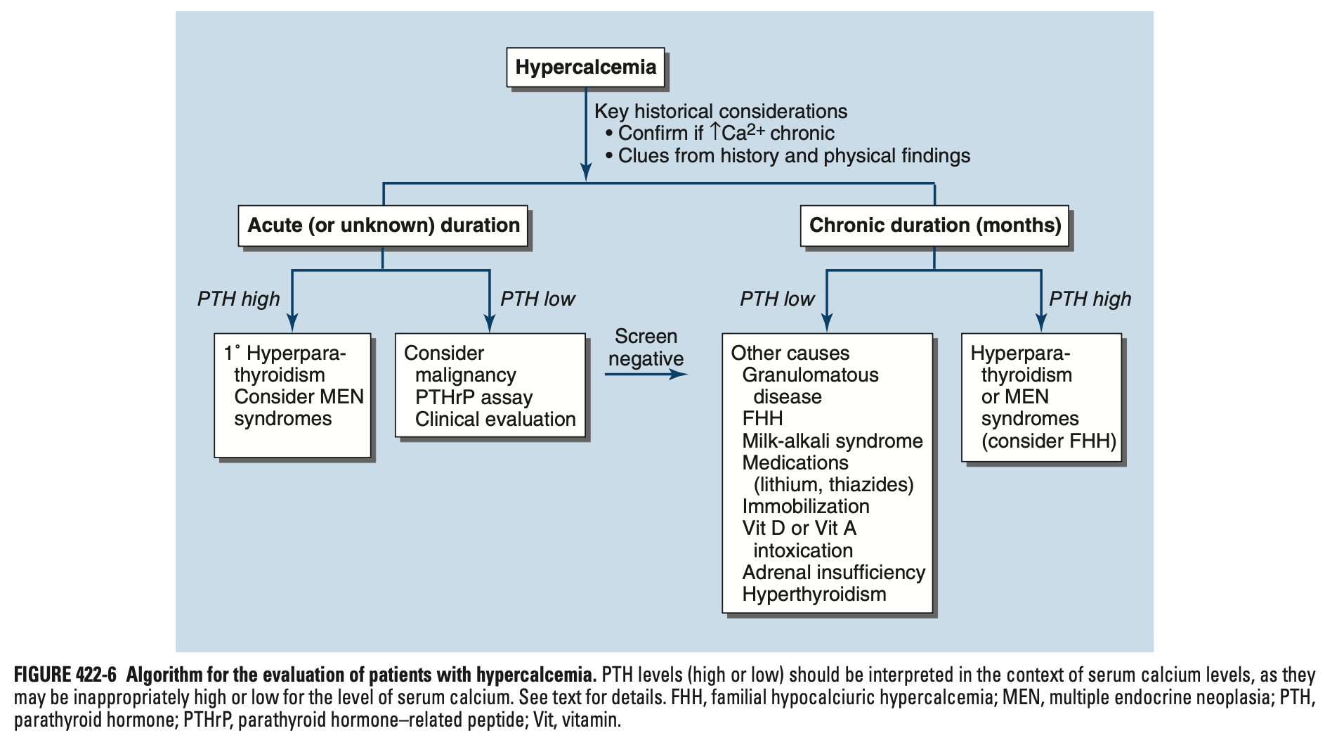 고칼슘혈증, 저인산혈증(또는 정상), 부적절하게 정상 또는 상승된 PTH