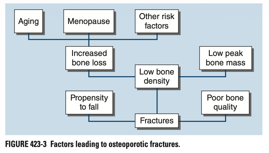 Intermediate Mechanisms: Low peak bone mass(낮은 최대 골량), Increased bone loss(골소실 증가), Low bone density(낮은 골밀도), Poor bone quality(골질 저하), Propensity to fall(낙상 경향)